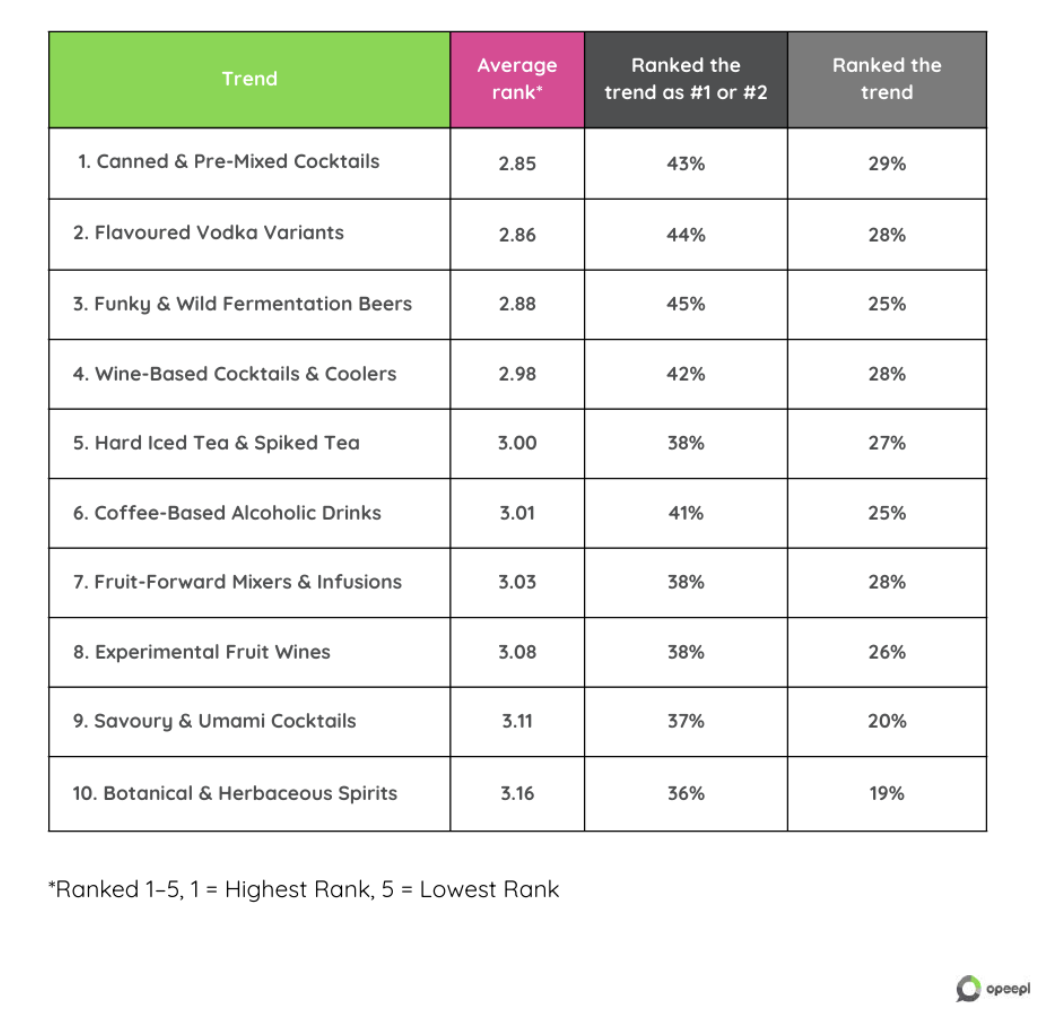44% of respondents picked them among their top two trends, especially younger drinkers who enjoy playful flavours and easy mixing. From berry to yuzu, it’s all about customising your drink.Funky & Wild Fermentation Beers: Craft goes creative.