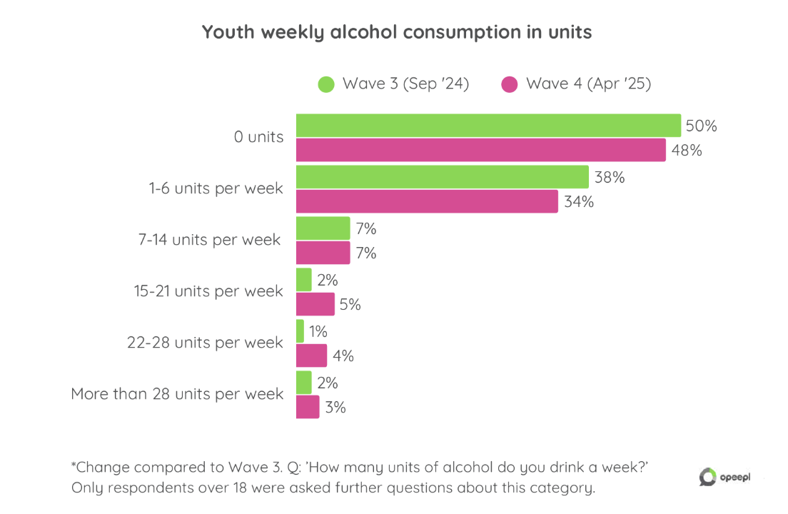 According to the study, 52% of 18–30-year-olds say they currently consume alcohol. That’s still the majority, but it’s lower than in previous waves, showing a steady decline in regular drinking habits.